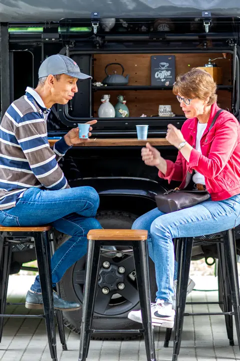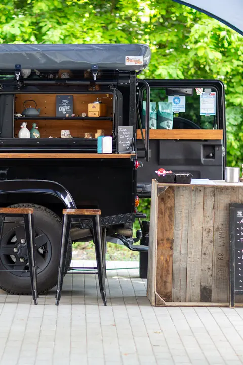 Le matin, nous accueillons L'atitude51 avec leur emblématique Land Rover Defender transformé, entièrement équipé en café ambulant.